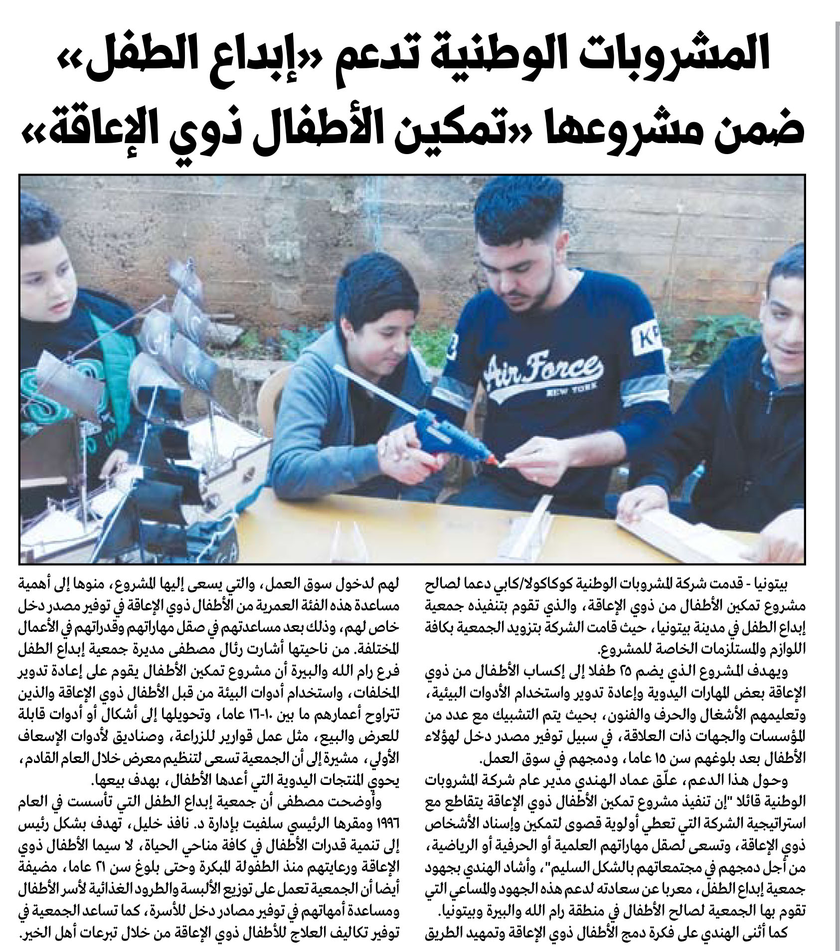 المشروبات الوطنية تدعم إبداع الطفل ضمن مشروعها تمكين الأطفال ذوي الإعاقة