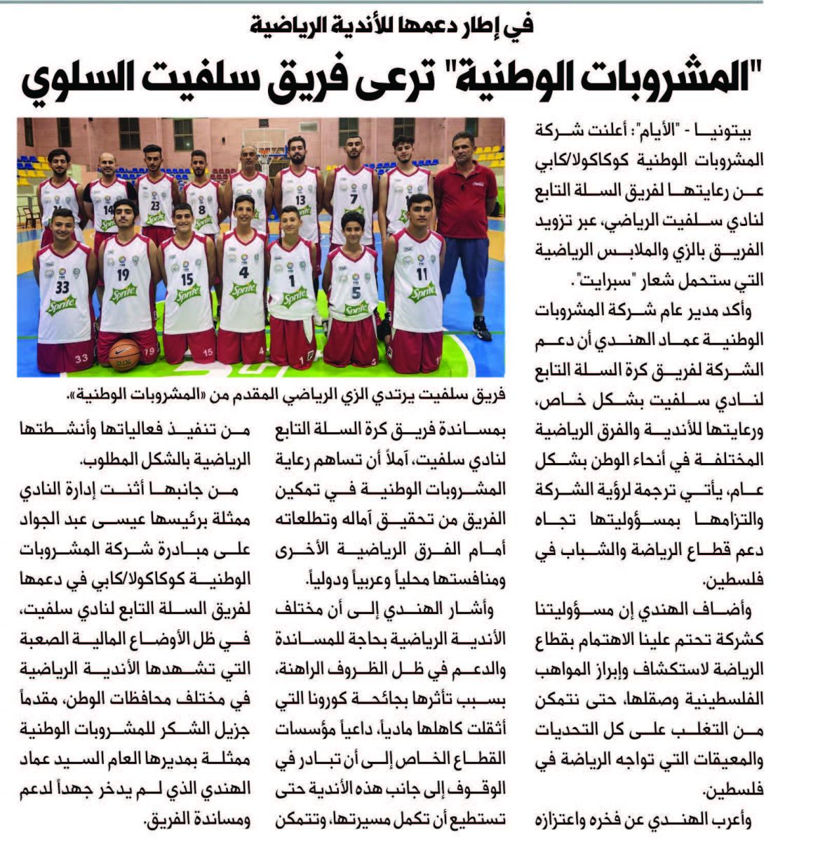 في اطار دعمها للاندية الرياضية، المشروبات الوطنية ترعى فريق سلفيت السلوي
