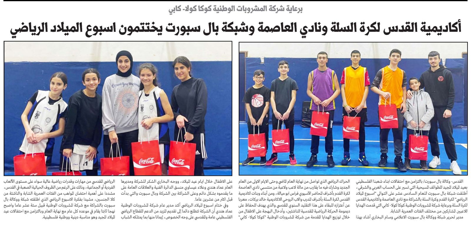 برعاية شركة المشروبات الوطنية كوكا كولا- كابي أكاديمية القدس لكرة السلة ونادي العاصمة وشبكة بال سبورت يختتمون اسبوع الميلاد الرياضي